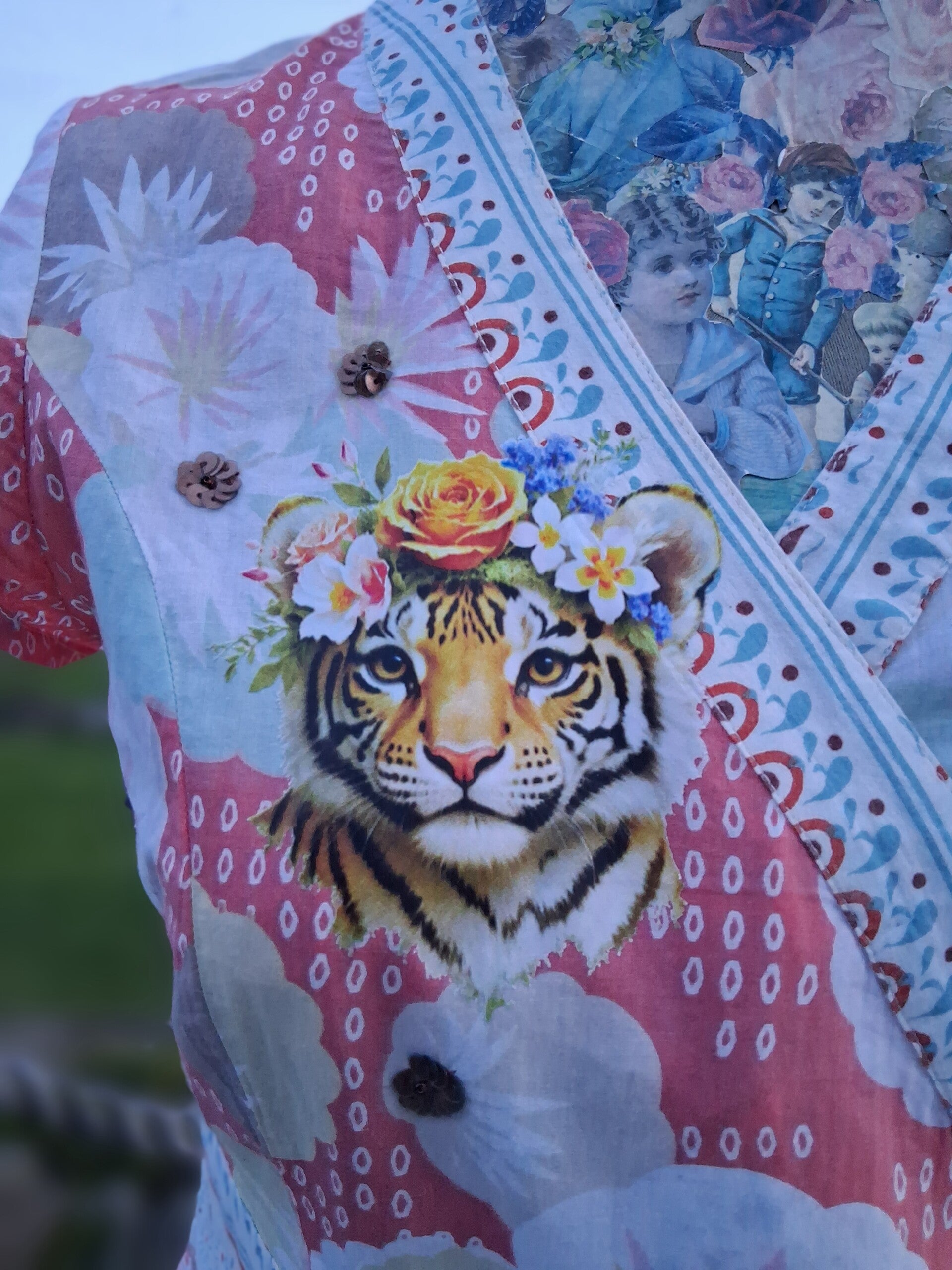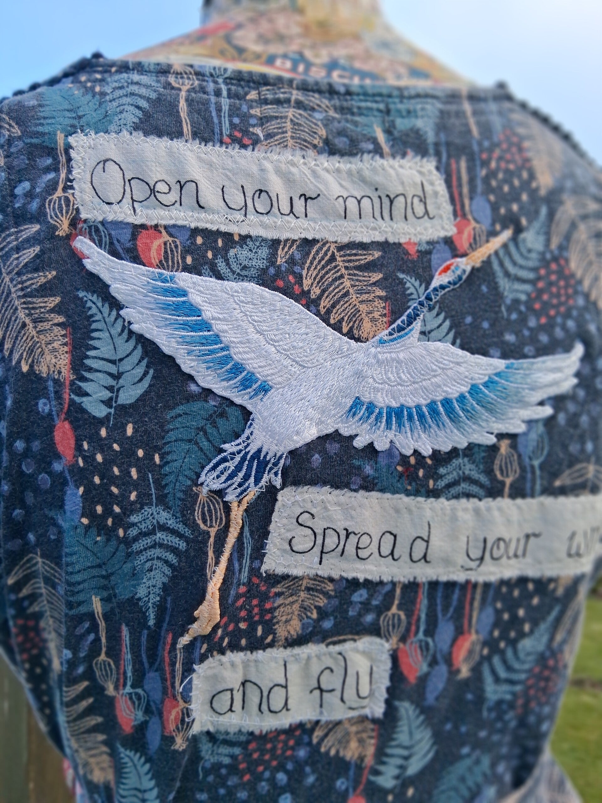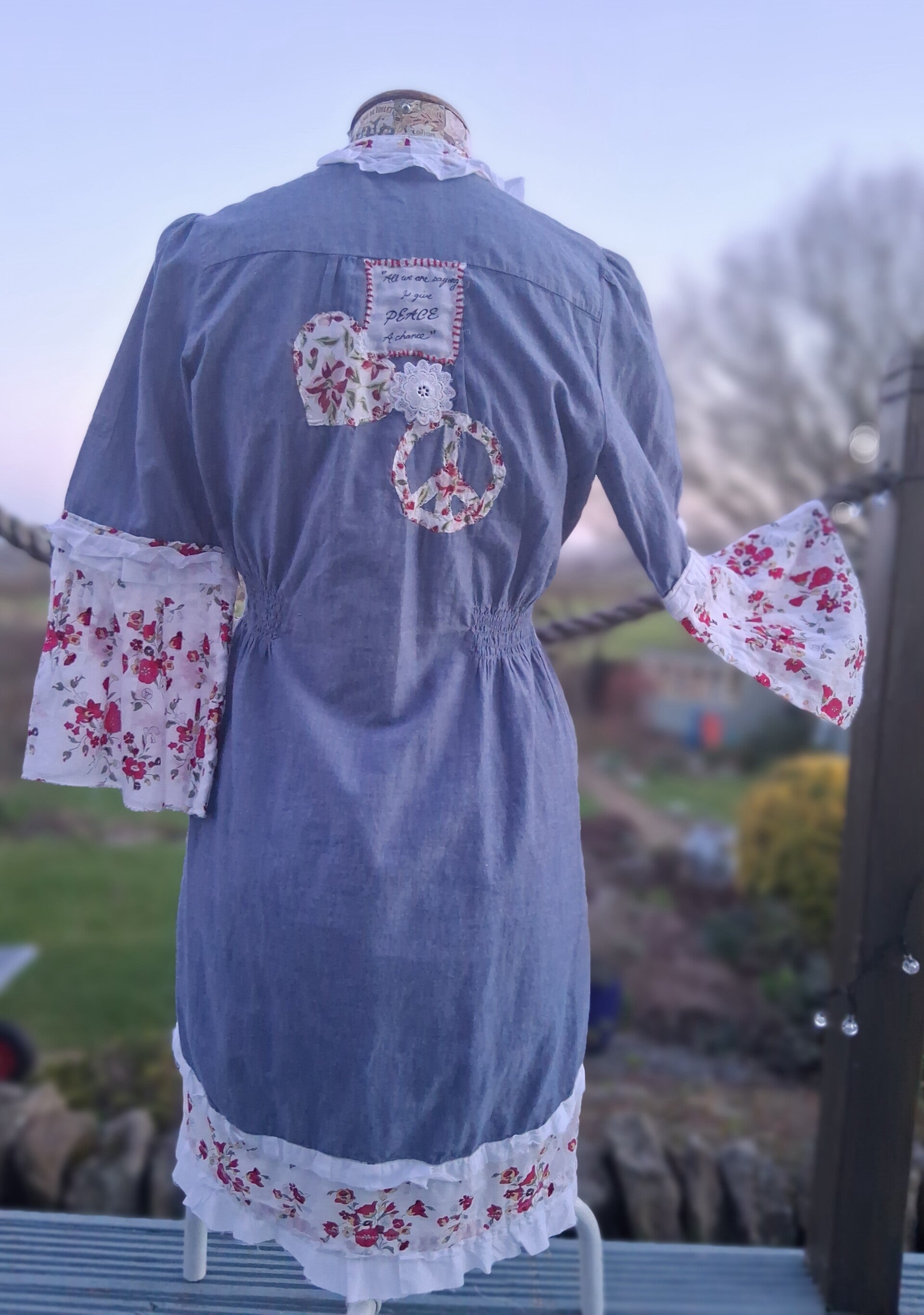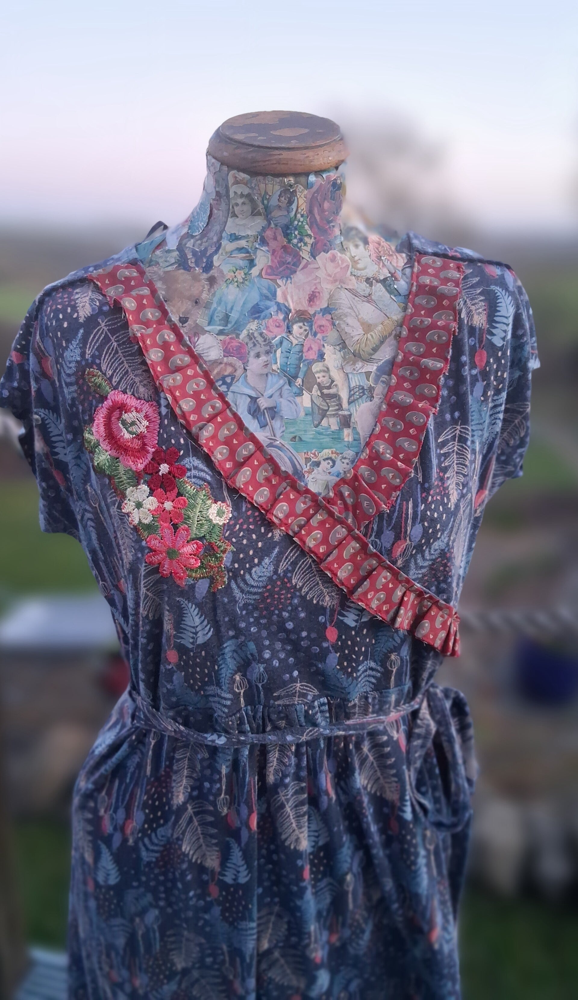 We envisage women who are passionate about wellbeing, art, and sustainability wearing our dresses. When you put on this eye-catching SoulStitch dress, we want you to feel connected, empowered, and inspired. Experience the joy of wearing a piece of art that reflects your values with this quirky and unique dress. With 3 dimensional flowers to the front and vibrant collage appliqués to the back with the words: 'The greatest thing you ever can do now, is trade a smile with someone who is blue now'.