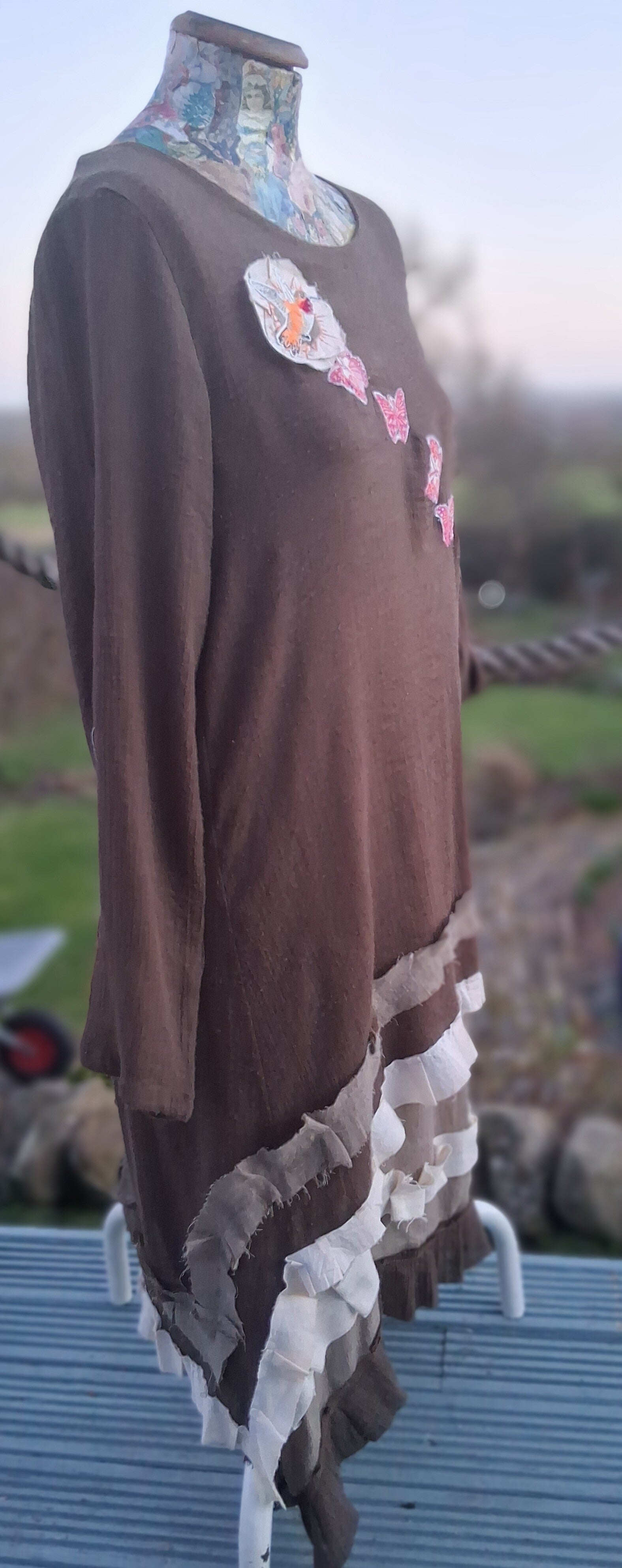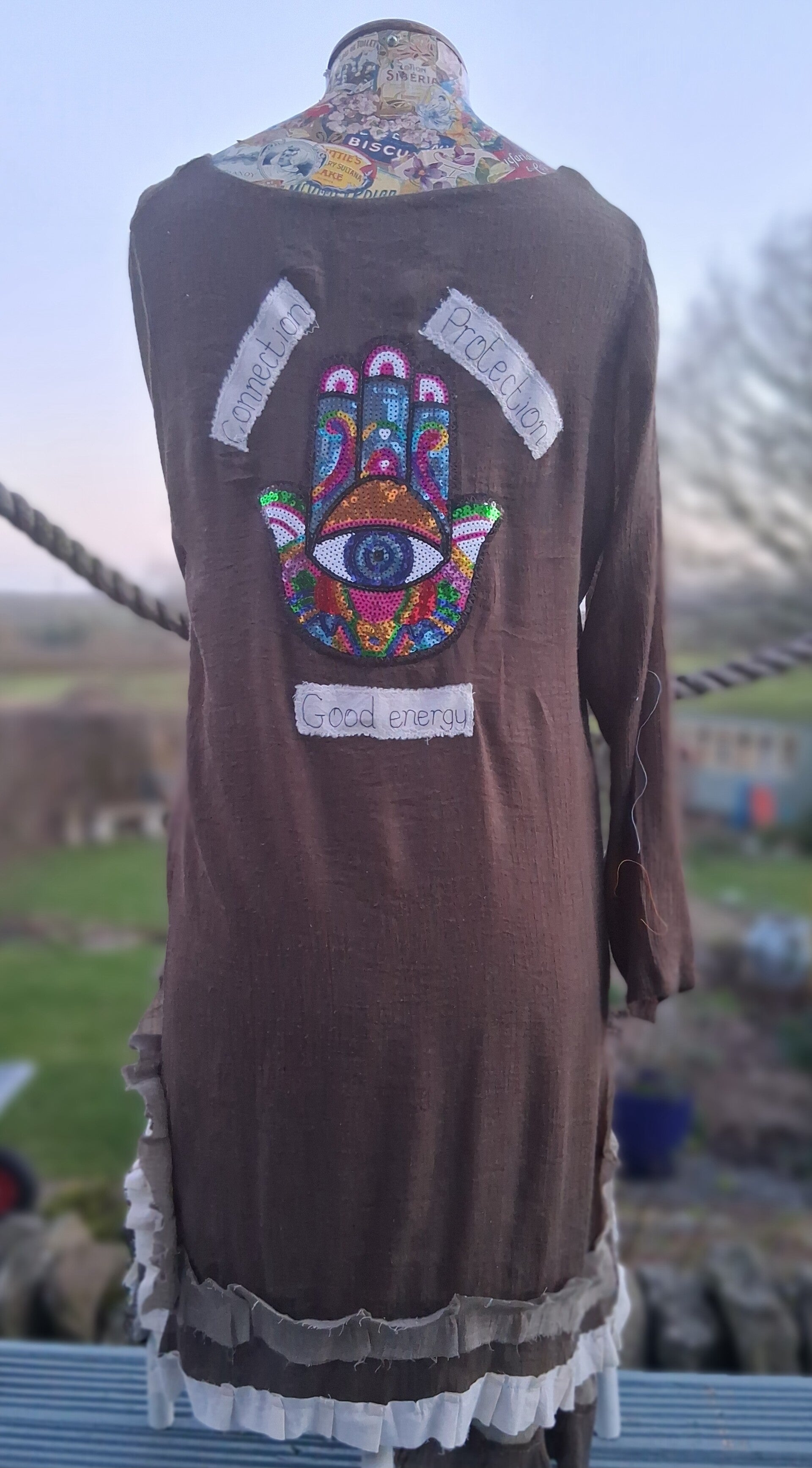 This brown linen dress with the colourful Hamsa or open hand of Fatima appliqued to the back representing protection. It has the words 'connection', 'protection' and 'good energy' surrounding the image. On the front is a hand-crafted rosette adorning a playful orange bird connecting you back to nature. Raw edged frills add to the relaxed and comfortable vibe. Linen blend fabric.