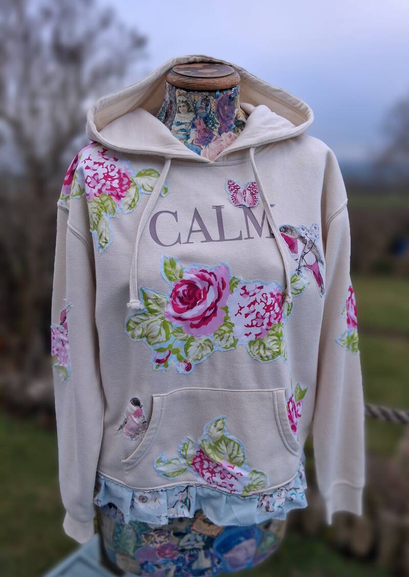 Our hooded sweatshirts are more than just clothing; they're uniquely upcycled statement pieces adorned with wellbeing messages. We transform pre-loved materials into wearable art, giving you a one-of-a-kind garment that tells a story and promotes positive vibes. Stand out from the crowd with this consciously crafted cream hoodie with the word 'Calm' printed across the front. Delicately feminine birds, butterflies and flowers in pastel colours adorn this cosy top to give you a hug in a hoodie. Cotton blend.